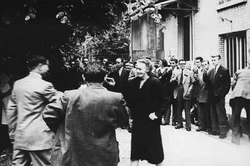 ▲约里奥-居里夫人(前排左三)祝贺杨承宗(前排左一)获得博士学位。