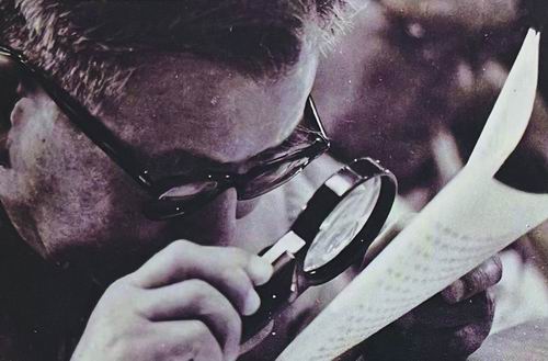 当时他的右眼已看不见,左眼白内障逐年严重,医生要求他耐心等待到白内障成熟期方可手术,他年年满怀希望来京问诊又失望而归,看材料时眼睛几乎贴到放大镜上。