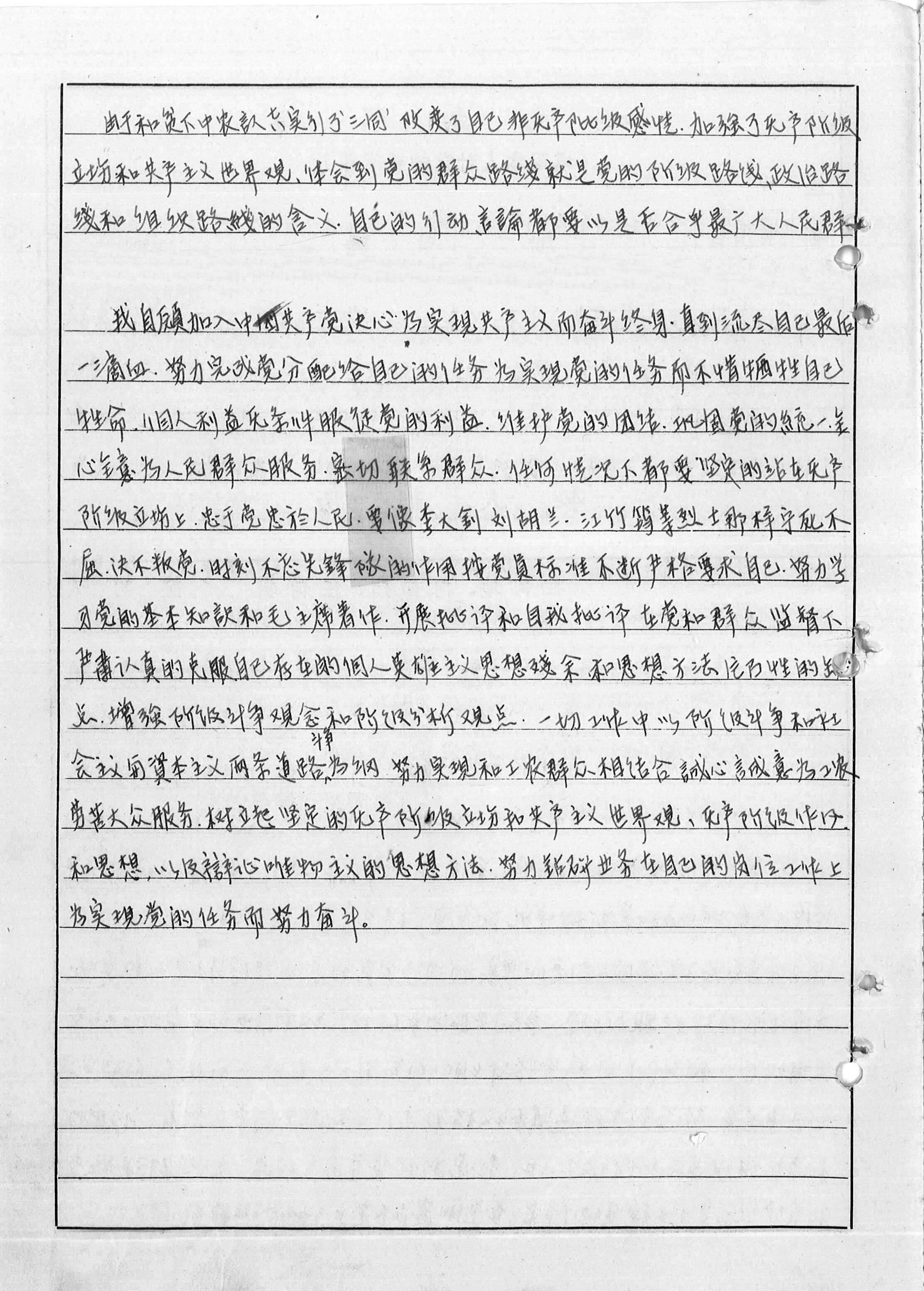 督下严肃认真地克服自己存在的个人英雄主义思想残余和思想方法片面性的缺点……努力实现和工农群众相结合,诚心诚意为工农劳苦大众服务,树立起坚定的无产阶级立场和共产主义世界观、无产阶级作风和思想,以及辩证唯物主义的思想方法,努力钻研业务,在自己的岗位工作上为实现党的任务而努力奋斗。