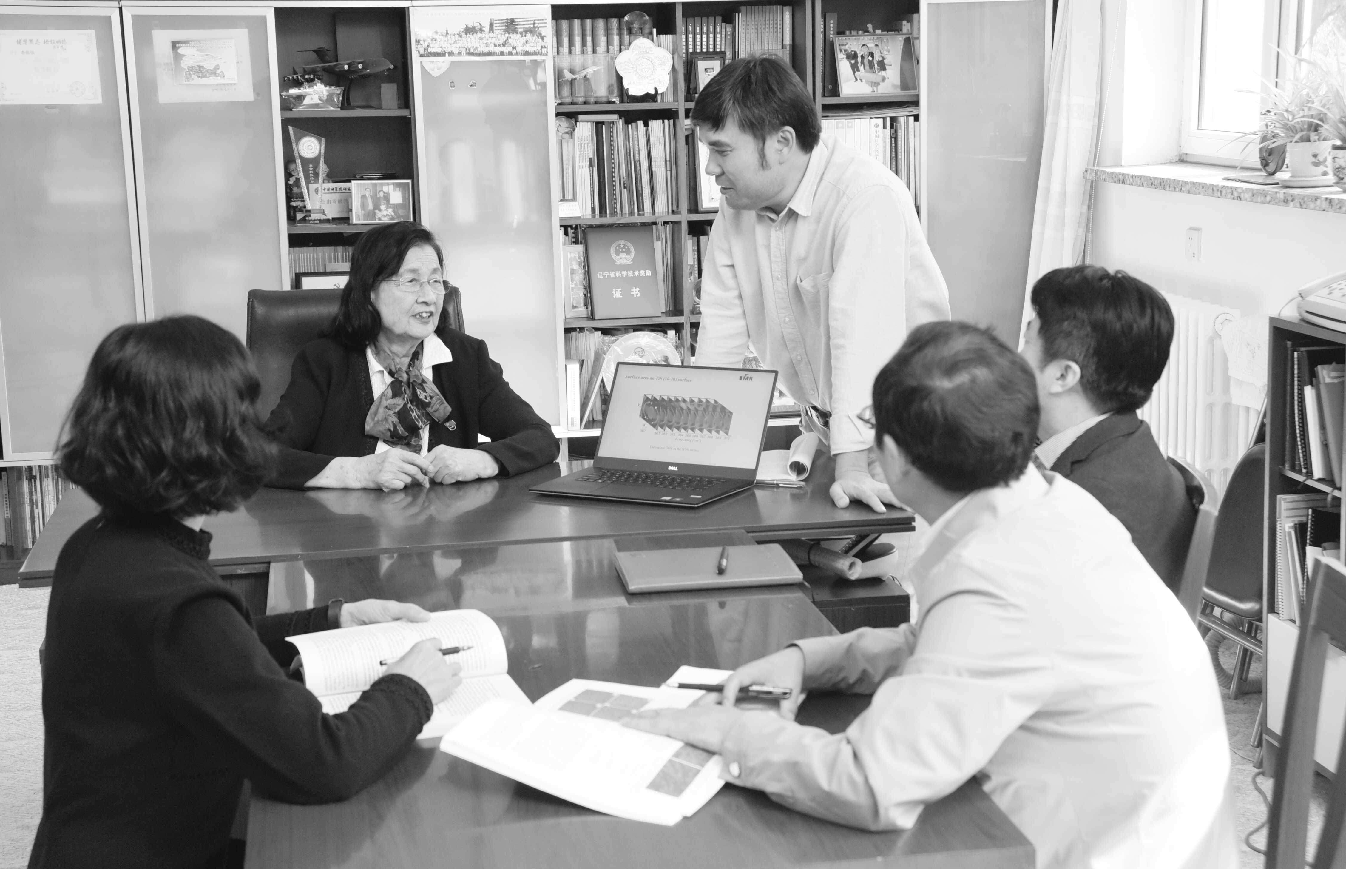 2019 年李依依(左二)在金属研究所与科研人员讨论轴承钢 研发进展