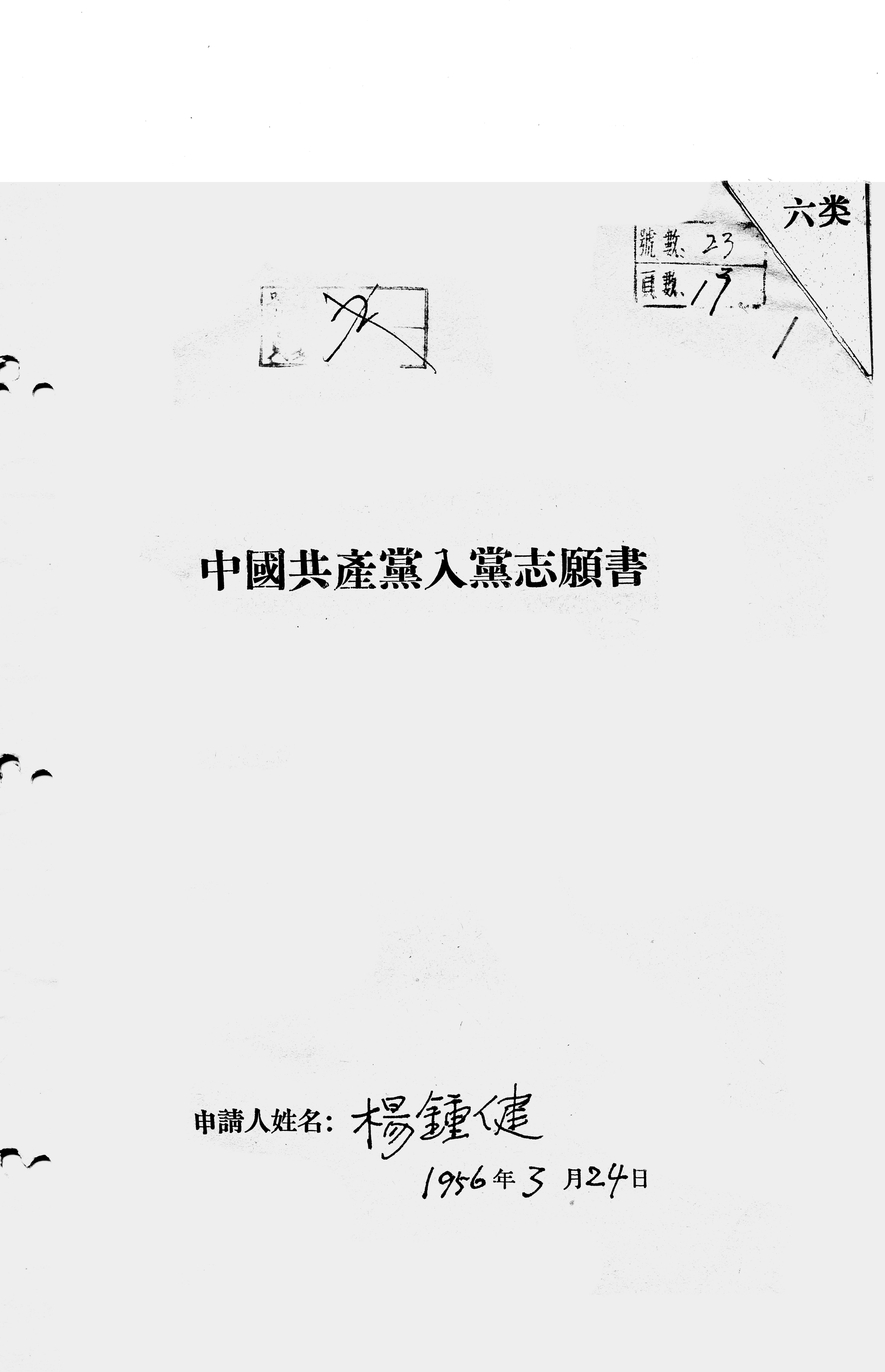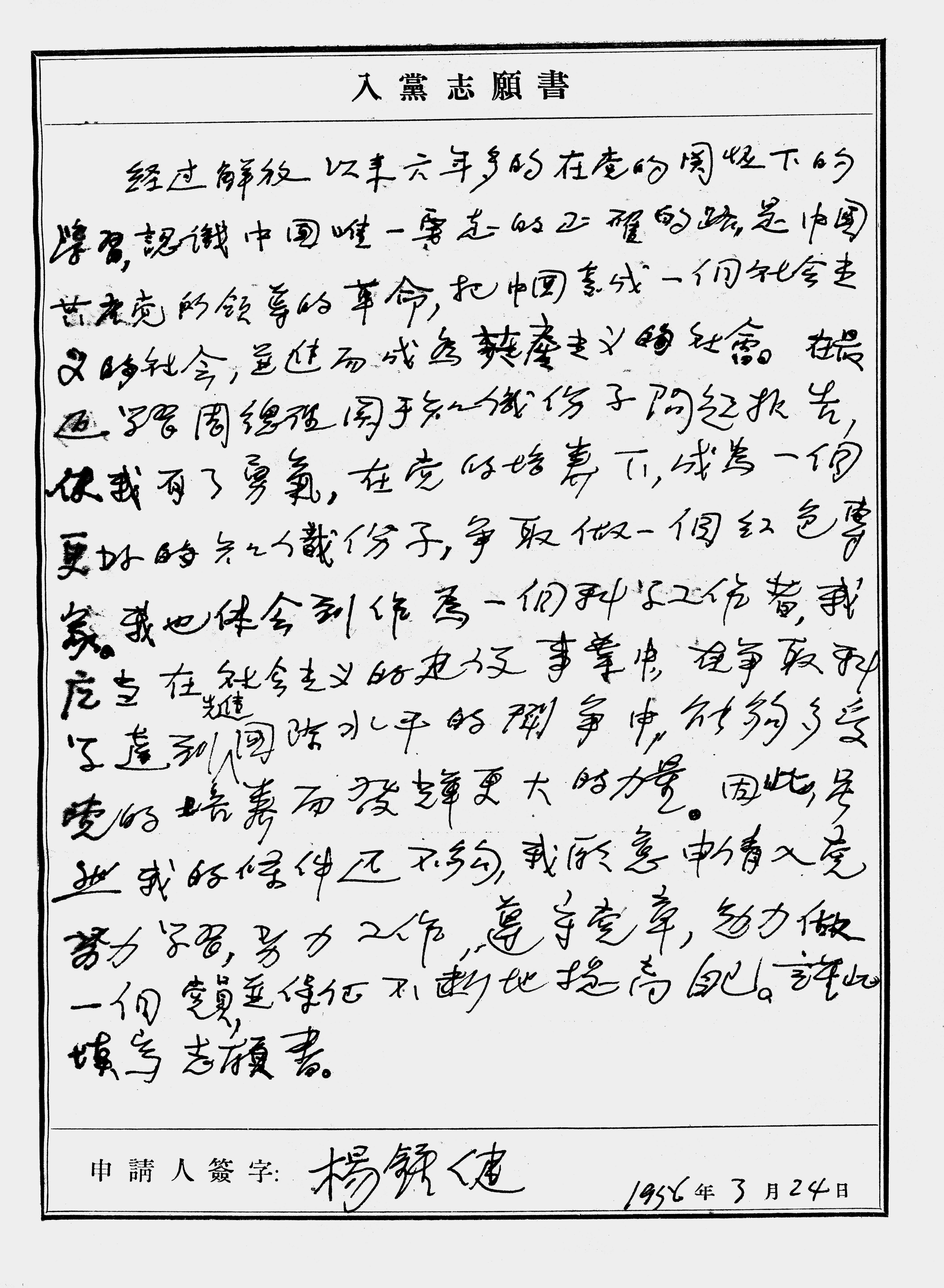 经过解放以来六年多的在党的关怀下的学习,认识中国唯一要走的正确的路,是中国共产党所领导的革命,把中国变成一个社会主义的社会,并进而成为共产主义的社会。在最近学习周总理关于知识分子问题报告,使我有了勇气,在党的培养下,成为一个更好的知识分子,争取做一个红色专家。我也体会到作为一个科学工作者,我应当在社会主义的建设事业中,在争取科学达到先进国际水平的斗争中,能够多受党的培养而发挥更大的力量。因此,虽然我的条件还不够,我愿意申请入党,努力学习,努力工作,遵守党章,努力做一个党员,并保证不断地提高自己。谨此填写志愿书。