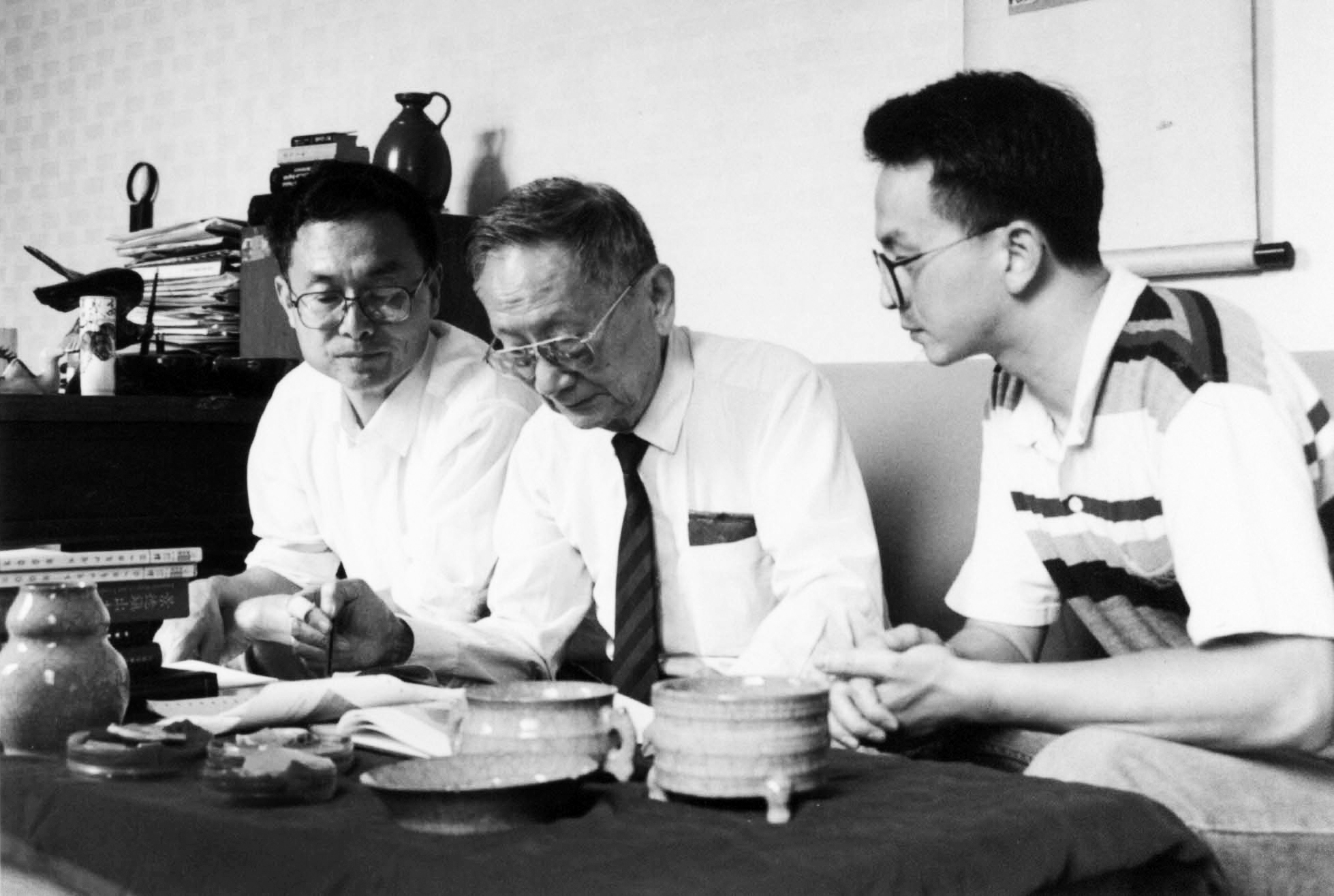 1999 年李家治(中)在上海硅酸盐研究所与课题组人员进行古陶瓷研究