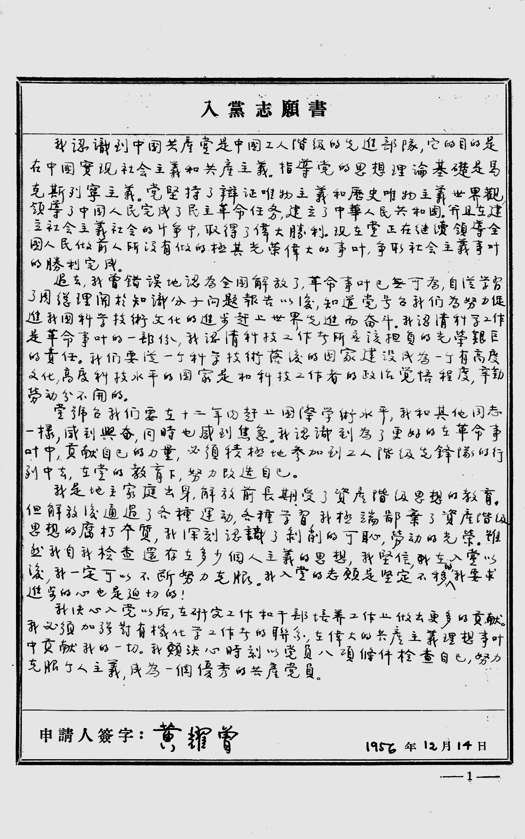 我决心入党以后,在研究工作和干部培养工作上做出更多的贡献。我必须加强与有机化学工作者的联系,在伟大的共产主义理想事业中贡献我的一切。我愿决心时刻以党员八项条件检查自己,努力克服个人主义,成为一个优秀的共产党员。