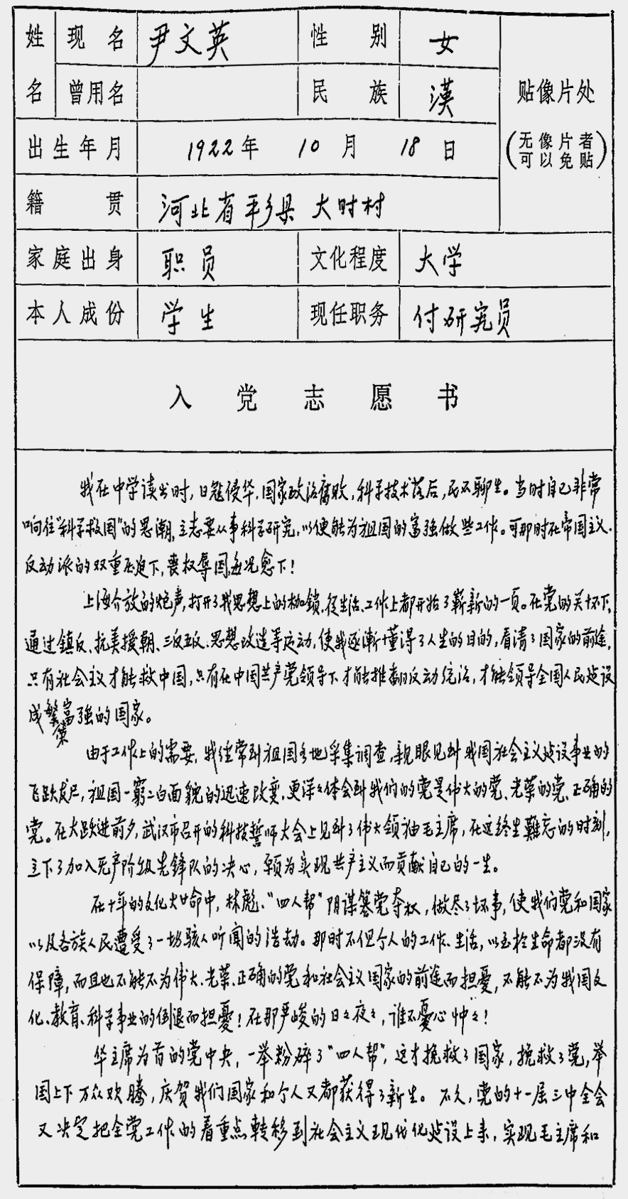 从1958年第一次递交入党申请书到1979年正式入党,历时20多年。这20多年里,尹文英疑惑过、迷茫过、委屈过,她最终选择了坚持,为了自己的理想坚持不懈地奋斗。