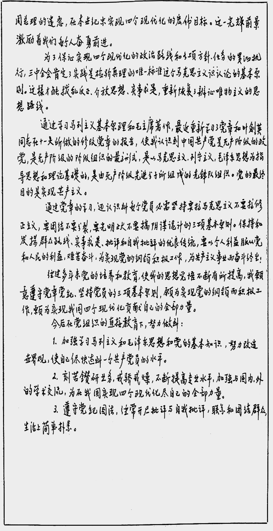 经过多年来党的培养和教育,使我的思想觉悟不断有所提高,我愿意遵守党章党纪、坚持党员的三项基本原则,愿为实现党的纲领而积极工作,愿为实现我国四个现代化贡献自己的全部力量。