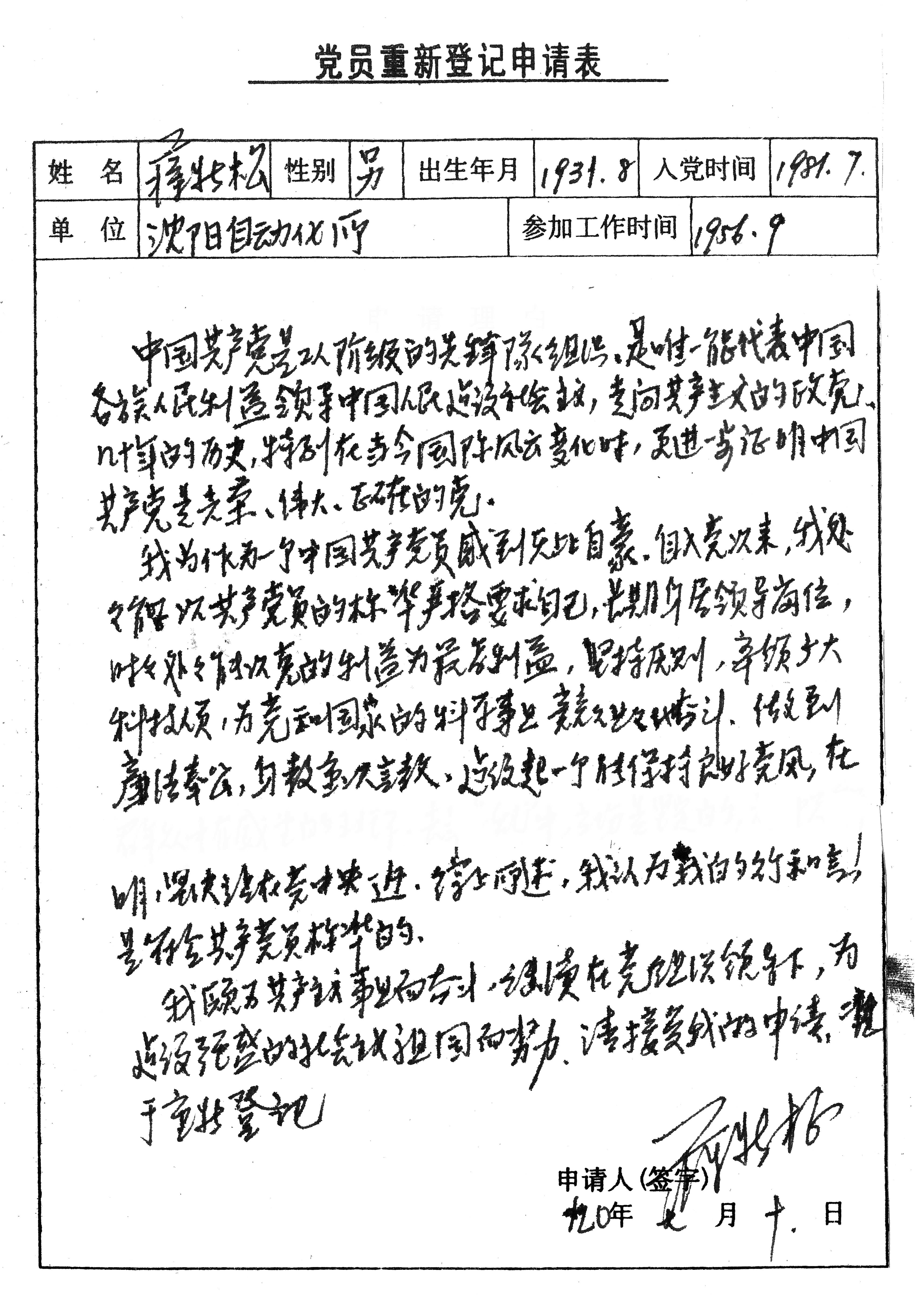通过伟大的思想改造运动,我初步清理了头脑中个人主义与集体主义的矛盾。什么才是青年最远大的理想?认识了中国共产党是中国工人阶级的先锋队,是中国革命的领导核心,是中国各民族人民利益的忠实代表。认识到社会发展的客观规律,社会主义经过生产力的巨大发展和政治、文化上的巨大进步,最后必然发展为消灭一切阶级差别,实现各尽所能的共产主义。这是人类历史上最伟大与最豪迈的事业。作为一个革命青年应该以此作为自己的理想与抱负。(一九)五三年在北京俄专留苏预备部曾首次向党组织提出了入党申请。
