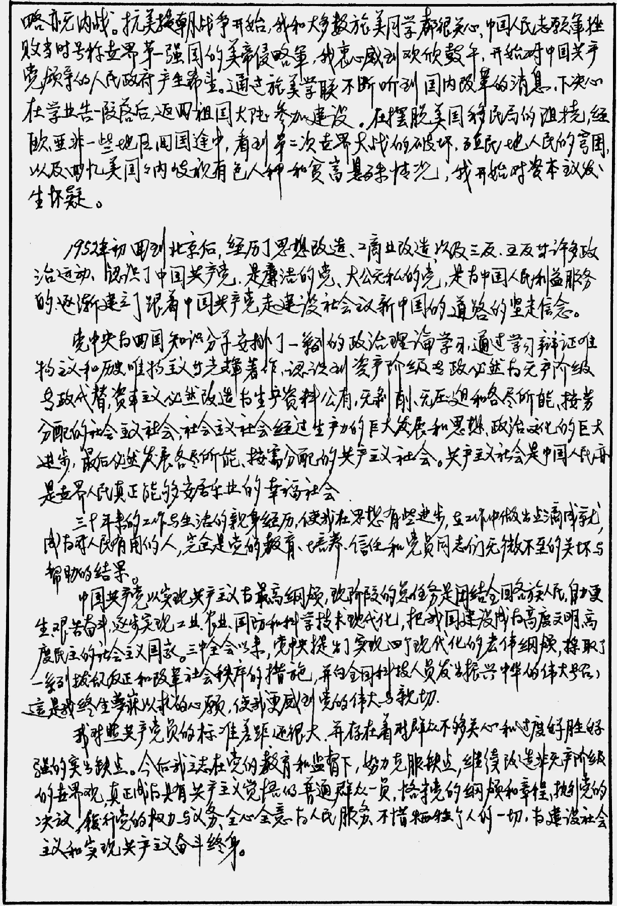 党中央为回国知识分子安排了一系列的政治理论学习,通过学习辩证唯物主义和历史唯物主义等光辉著作,认识到资产阶级专政必然为无产阶级专政代替,资本主义必然改造为生产资料公有、无剥削、无压迫和各尽所能、按劳分配的社会主义社会,社会主义社会经过生产力的巨大发展和思想、政治文化的巨大进步,最后必然发展(成)各尽所能、按需分配的共产主义社会。共产主义社会是中国人民亦是世界人民真正能够安居乐业的幸福社会。三十年来的工作与生活的亲身经历,使我在思想上有些进步,在工作中做出点滴成就,成为对人民有用的人,完全是党的教育、培育、信任和党员同志们无微不至的关怀与帮助的结果。