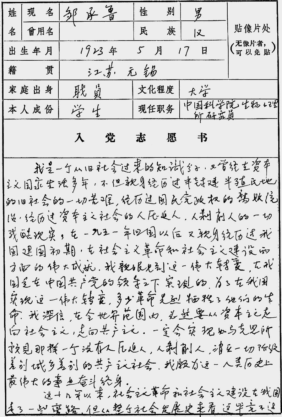 我是一个从旧社会过来的知识分子,又曾经在资本主义国家生活多年,不但亲身经历过半封建半殖民地的旧社会的一切苦难,经历过国民党政权的腐败统治,经历过资本主义社会的人压迫人、人剥削人的一切残酷现实,在一九五一年回国以后又亲身经历过我国建国初期,在社会主义革命和社会主义建设两方面的伟大成就,我亲眼见到这一伟大转变,在我国是在中国共产党的领导之下实现的,为了在我国实现这一伟大转变,多少革命先烈牺牲了他们的生命,我深信,在全世界范围内,必然要从资本主义走向社会主义,走向共产主义。一定会实现如马克思所预见那样一个没有人压迫人、人剥削人,消灭一切阶级差别、城乡差别的共产主义社会,我愿为这一人类历史上最伟大的事业奋斗终身。