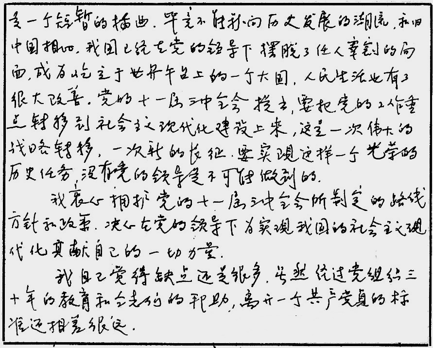 我衷心拥护党的十一届三中全会所制定的路线、方针和政策,决心在党的领导下为实现我国的社会主义现代化贡献自己的一切力量。