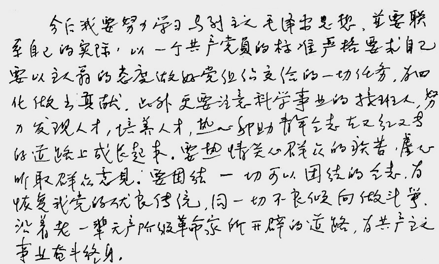 今后我要努力学习马列主义毛泽东思想,并要联系自己的实际,以一个共产党员的标准严格要求自己,要以主人翁的态度做好党组织交给的一切任务,为四化做出贡献。此外更要注意科学事业的接班人,努力发现人才,培养人才,热心帮助青年同志在又红又专的道路上成长起来。要热情关心群众的疾苦,虚心听取群众意见。要团结一切可以团结的同志,为恢复我党的优良传统,同一切不良倾向做斗争,沿着老一辈无产阶级革命家所开辟的道路,为共产主义事业奋斗终身。