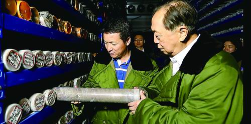 安芷生(右)、孙有斌在地球环境所东亚大陆环境岩芯基地查看岩芯。地球环境所供图