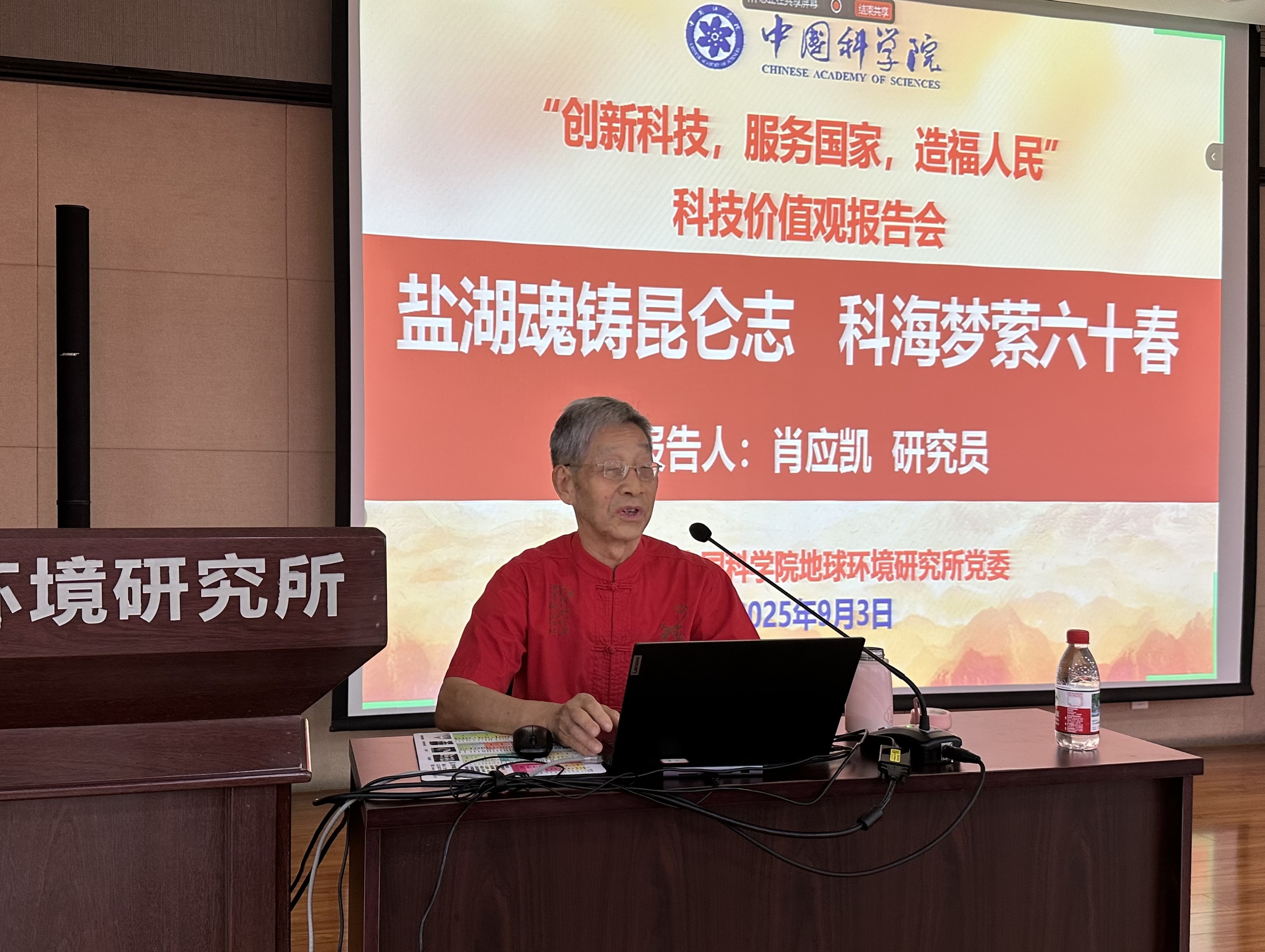 9月3日下午,为隆重纪念中国人民抗日战争暨世界反法西斯战争胜利80周年,大力弘扬“创新科技、服务国家、造福人民”的科技价值观和以“爱国、创新、求实、奉献、协同、育人”为核心的科学家精神,中国科学院地球环境研究所(以下简称地球环境所)党委邀请中国科学院青海盐湖研究所研究员肖应凯作科技价值观专题报告。本次报告会采用线上线下相结合的方式,研究所300余名职工、学生及所外100余人参加报告会,所党委副书记、副所长金章东主持报告会。