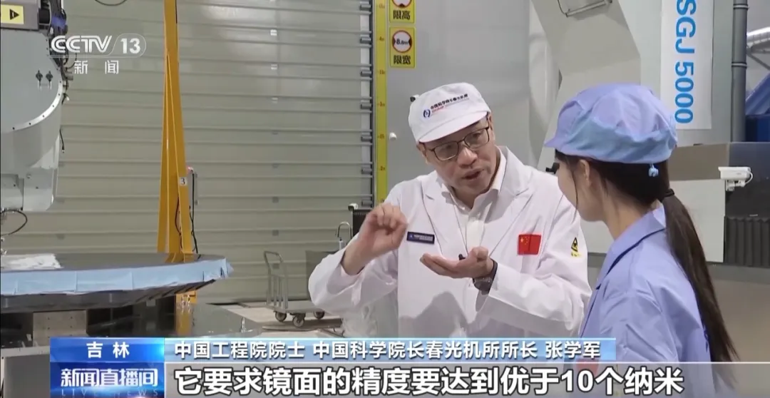 中国工程院院士、中国科学院长春光机所所长 张学军:相当于是人的眼睛一样,要想看到那么高的精度,它要求镜面的精度要达到优于10个纳米。打个比方,如果把这个镜面放大到60公里一个大圆,把土地平完之后去量这个高低差,要控制在±0.3毫米。